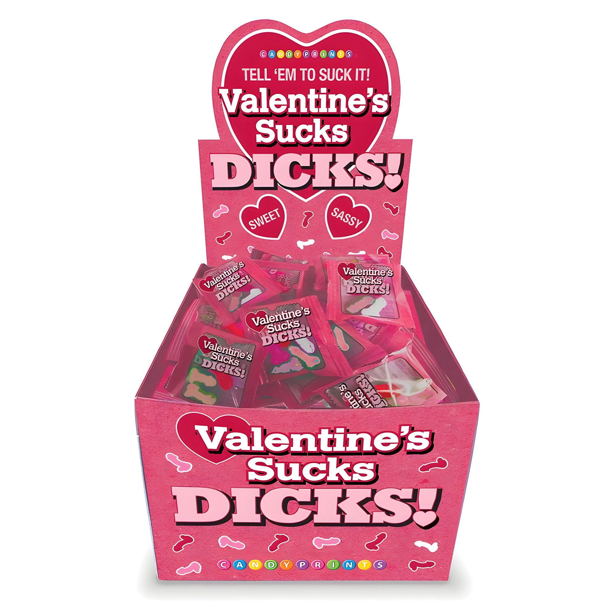 Celebra o burla el Día de San Valentín con la divertida exhibición de dulces Valentine's Sucks Dicks, que presenta 100 mini-paquetes de golosinas atrevidas.