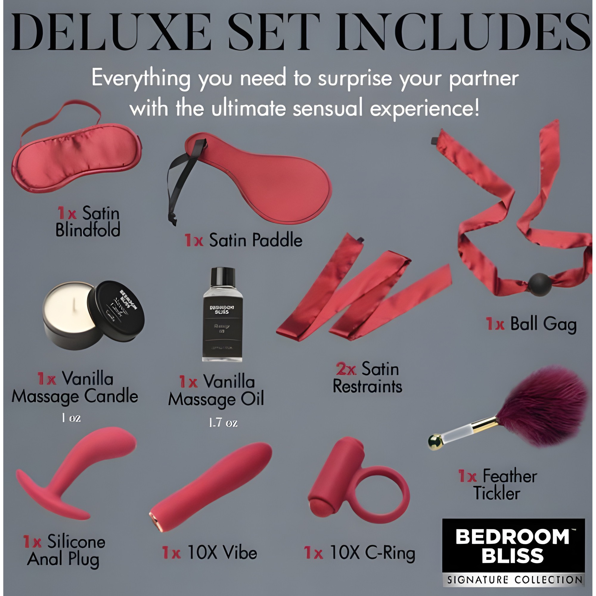 The Bedroom Bliss Lovers Bondage Massage Set is fantastic! It has everything you need for a romantic and adventurous night. The quality of each item is impressive, and it made for an unforgettable experience with my partner.