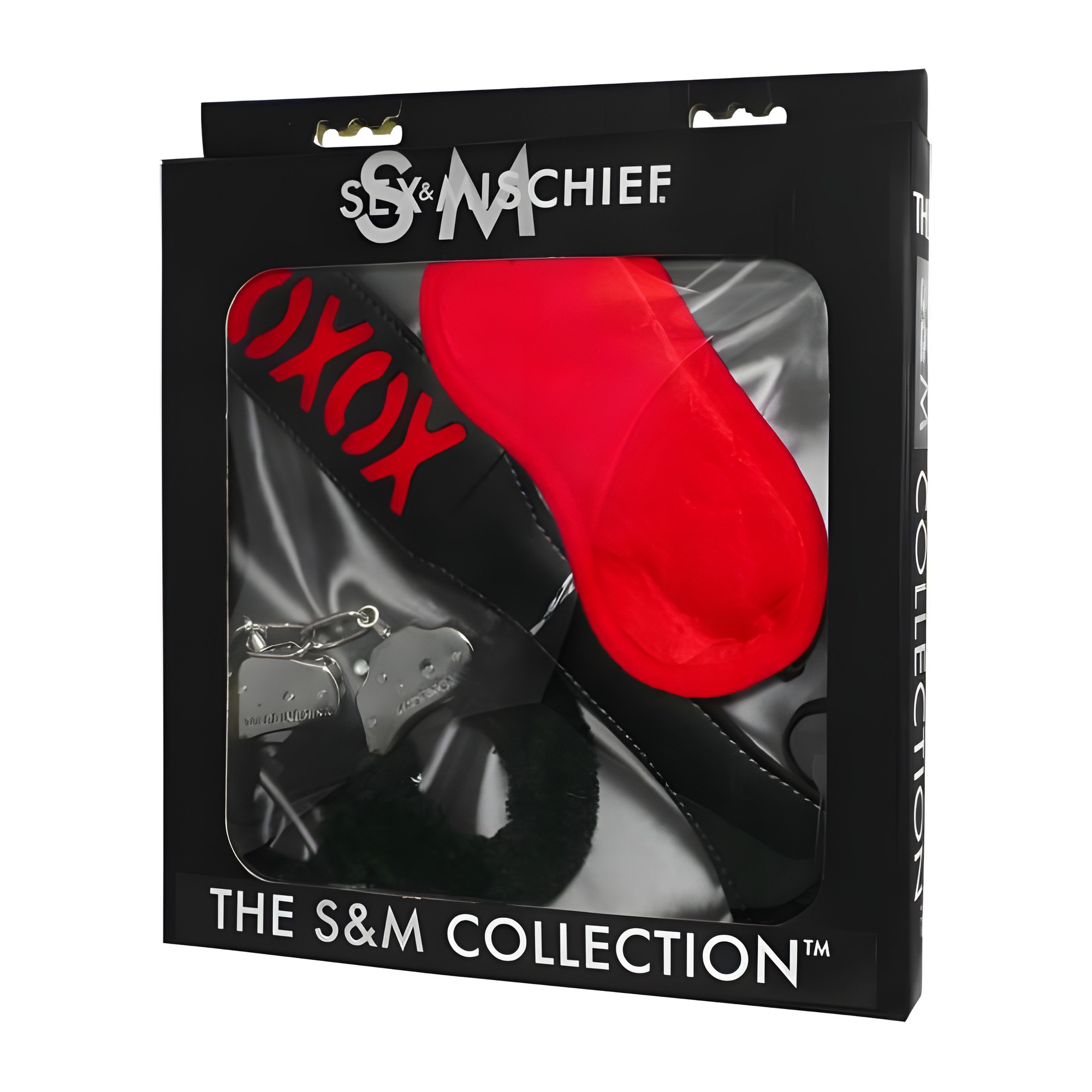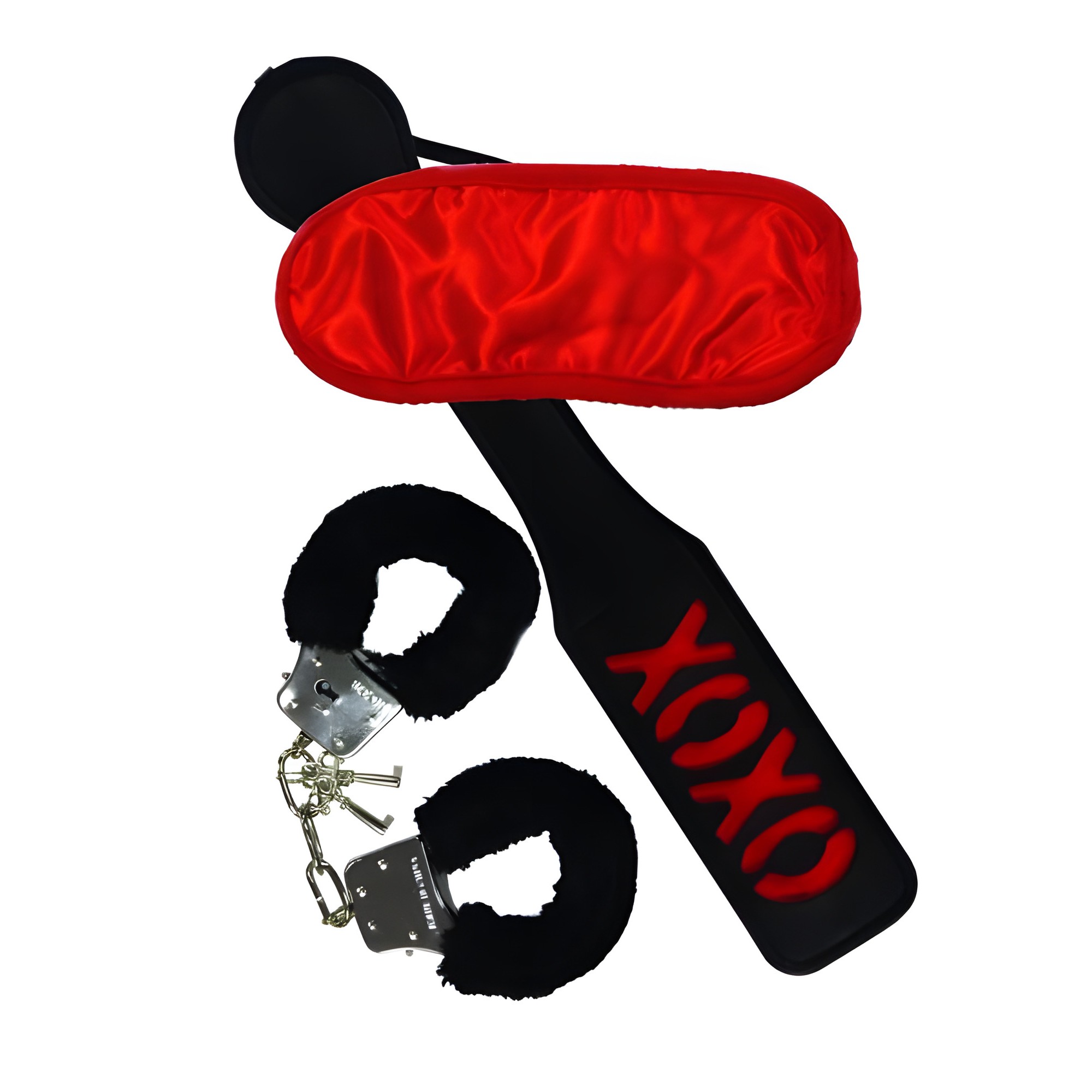 Este emocionante set de tres piezas incluye un antifaz, una paleta de cuero y esposas de peluche para una noche llena de provocación y placer.
