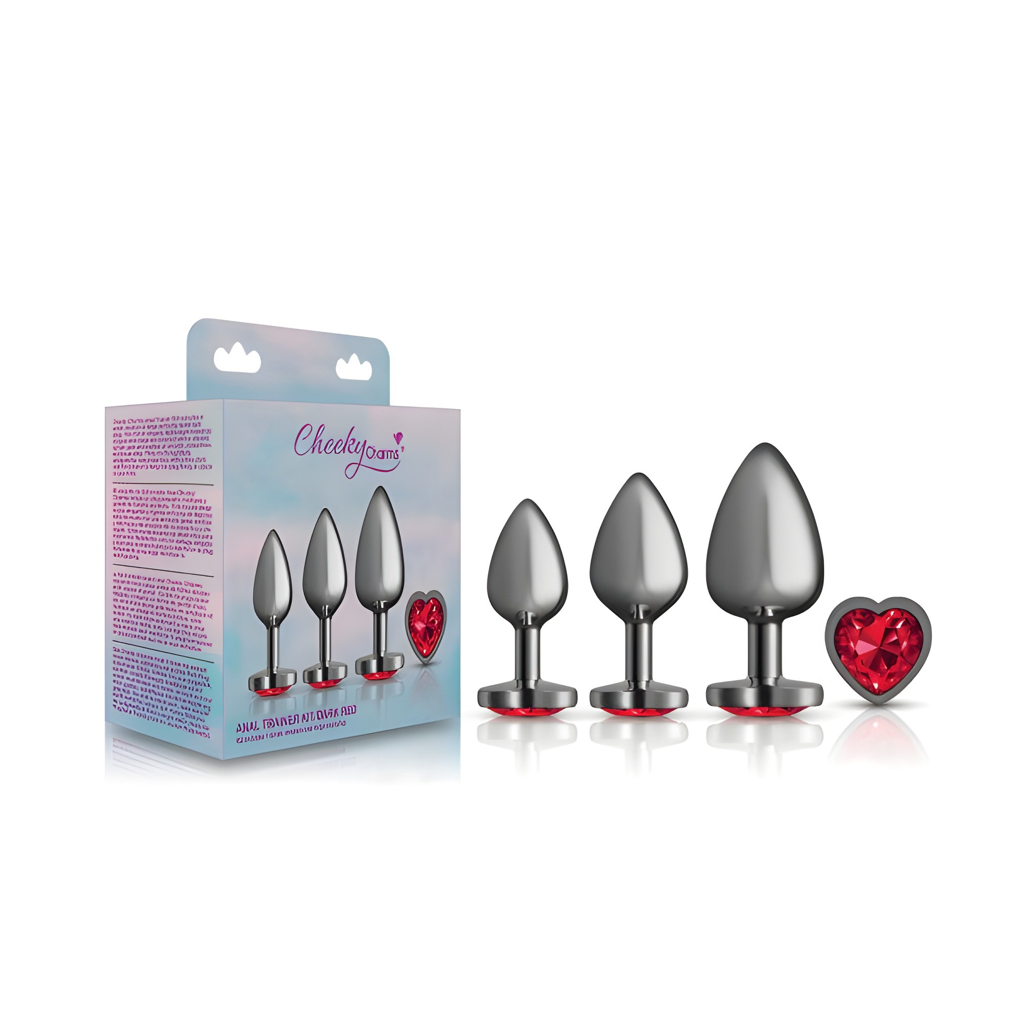 Explora nuevas sensaciones con el Kit de Entrenamiento Anal Cheeky Charms que incluye tres plugs anales metálicos de diferentes tamaños, perfectos para un entrenamiento gradual y juegos de temperatura.