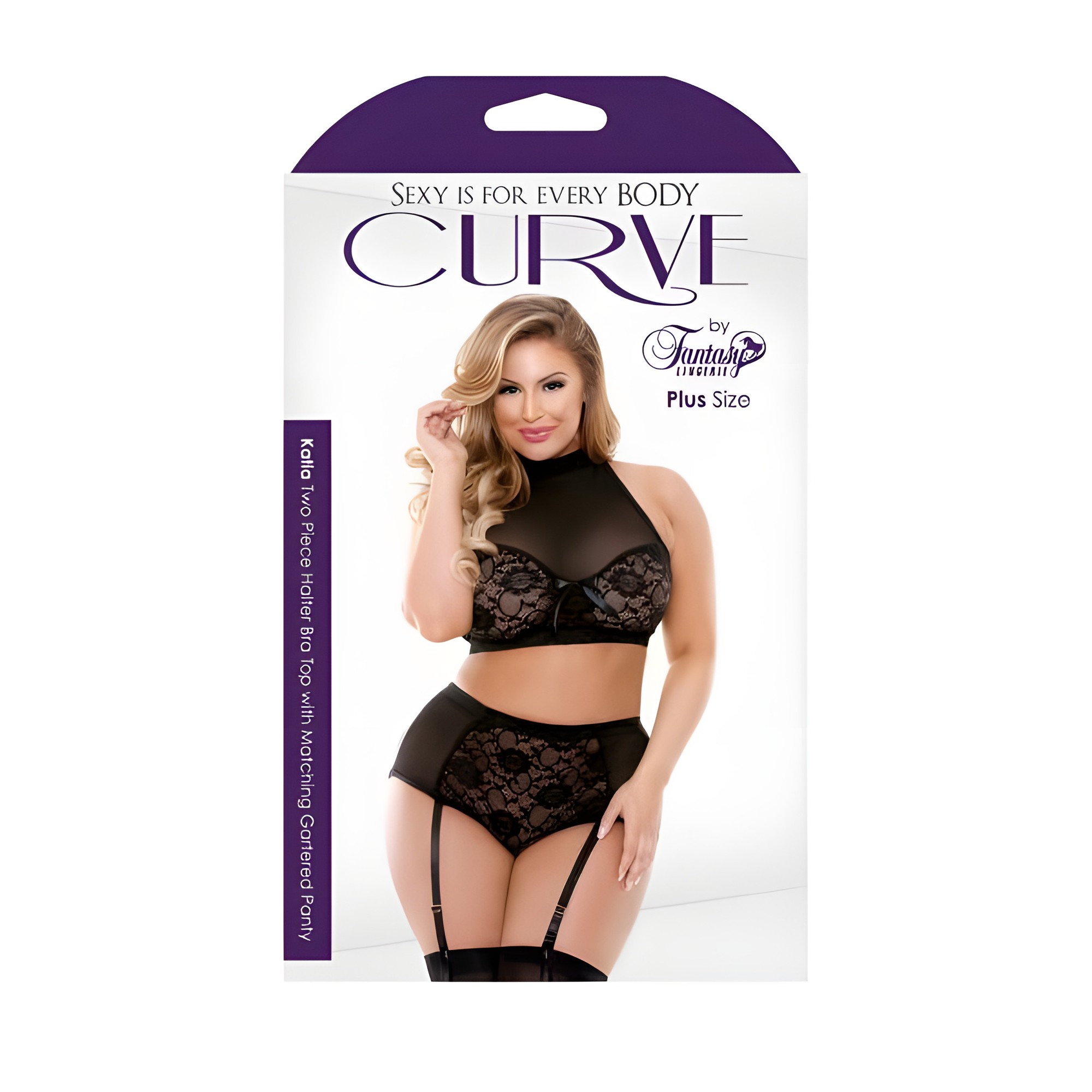 Eleva tu estilo en el dormitorio con el Conjunto de Sujetador Halter Curve Katia, que incluye un panty con suspensorio a juego.